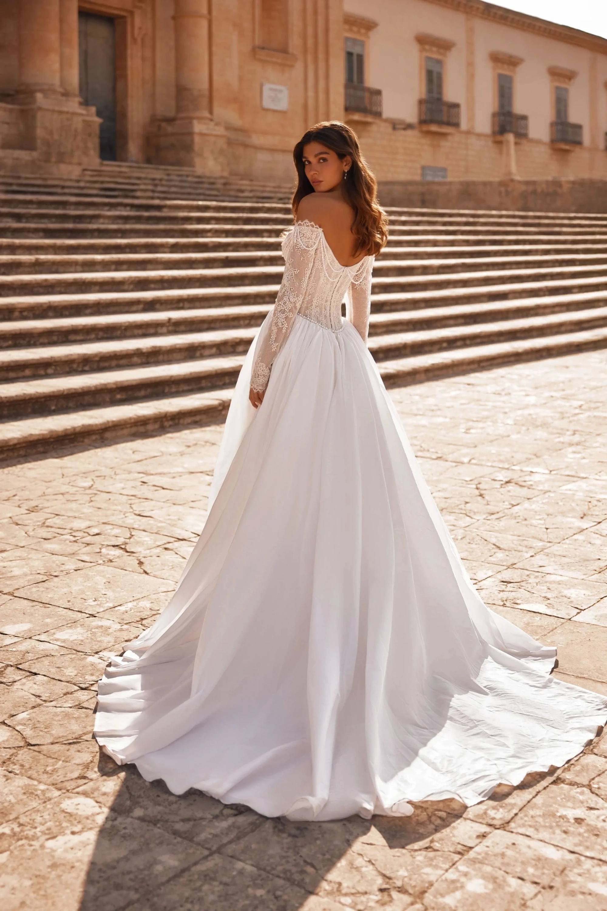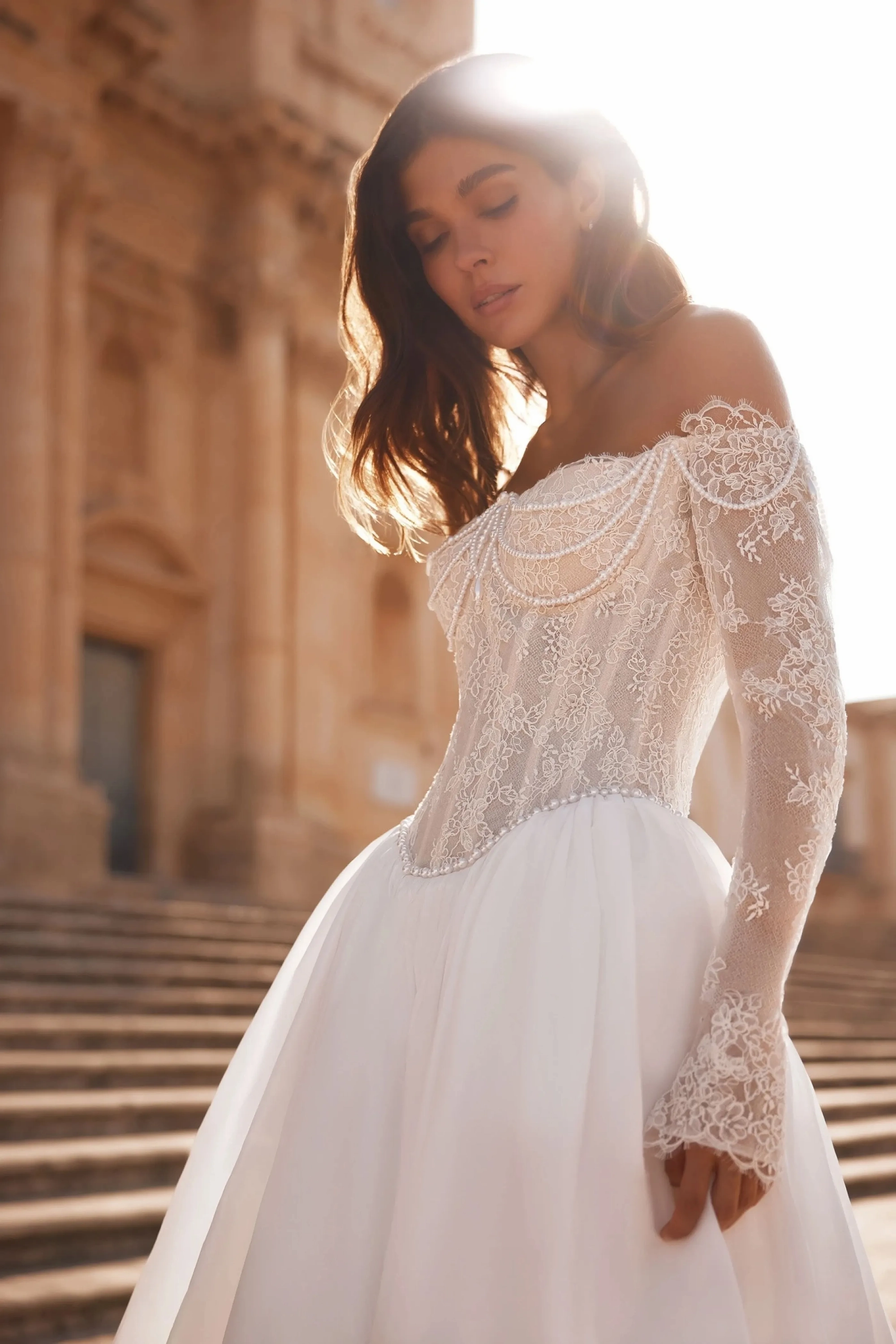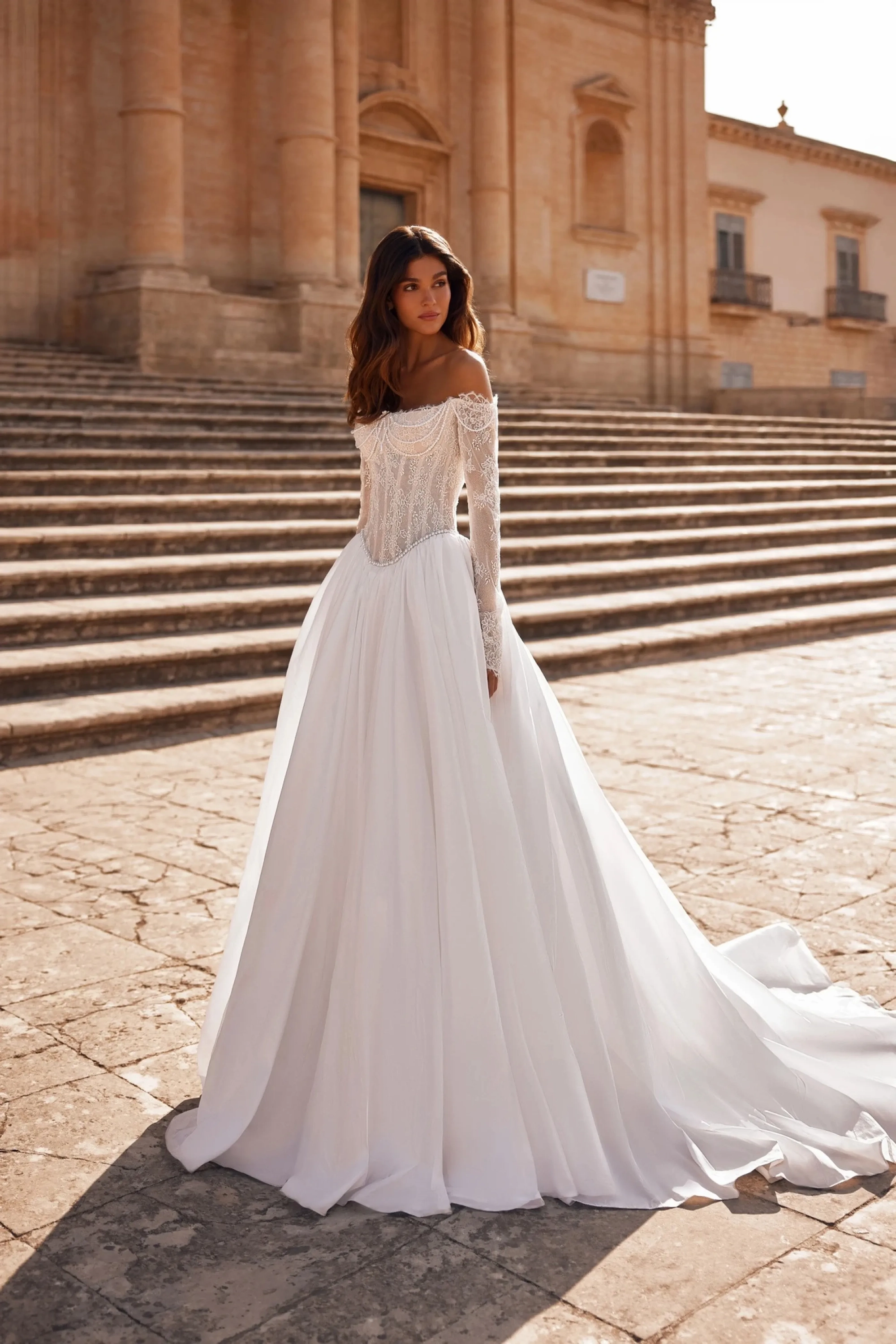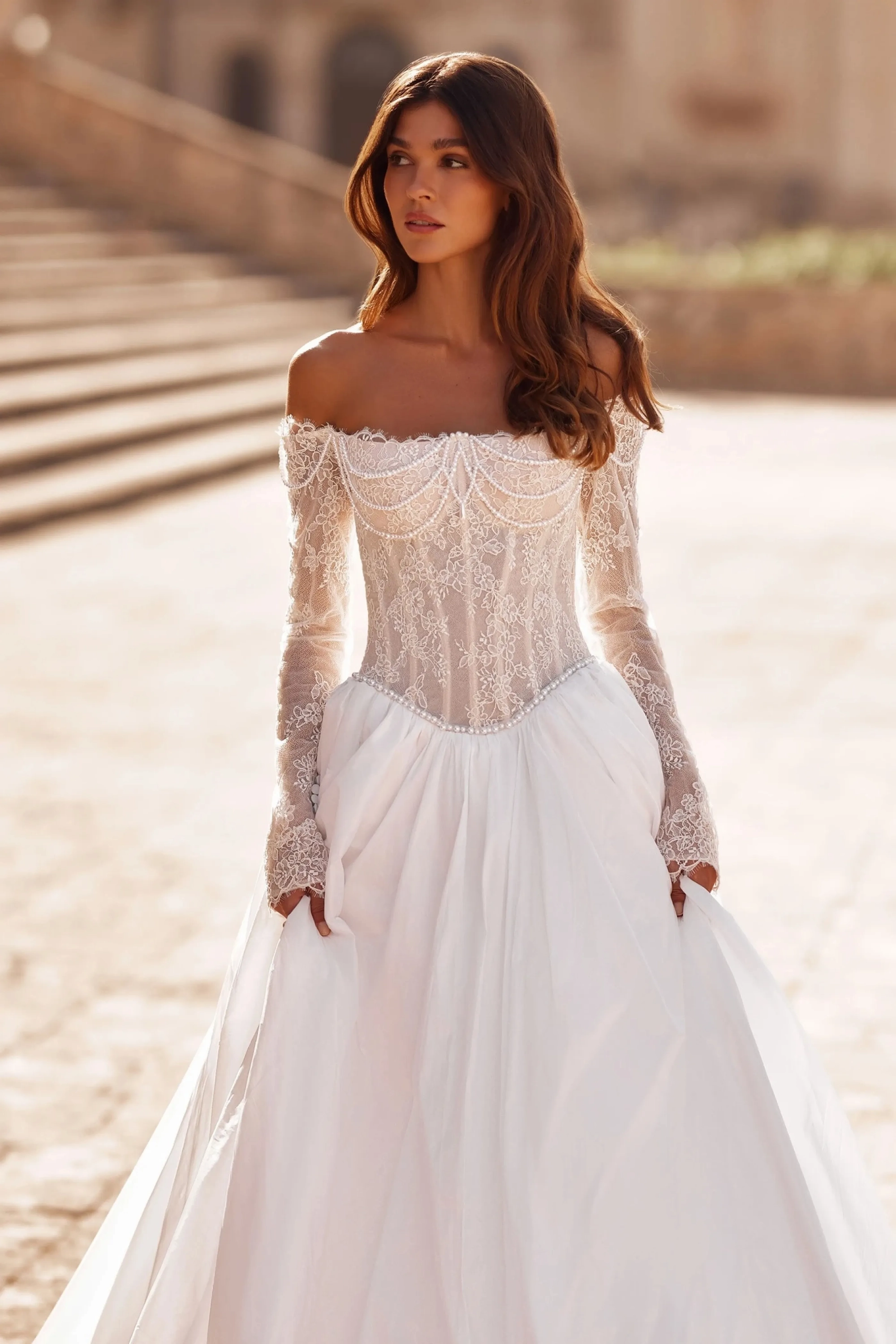 The ivory A-line gown embodies elegance and refined grace. The semi-sheer seagull-neck corset, made of lace and adorned with pearls, flows into long forearm-length sleeves accented with embroidery, adding sophistication to the look. The slightly concave back, positioned below the shoulder blades, with a hook-and-eye closure with extenders ensures a perfect fit and a polished silhouette. The full taffeta skirt with a train is gathered along the fitted seam line, creating volume and lightness in movement. An embroidered waistband at the natural waistline emphasizes the refined silhouette, while the concealed back zipper maintains clean lines.