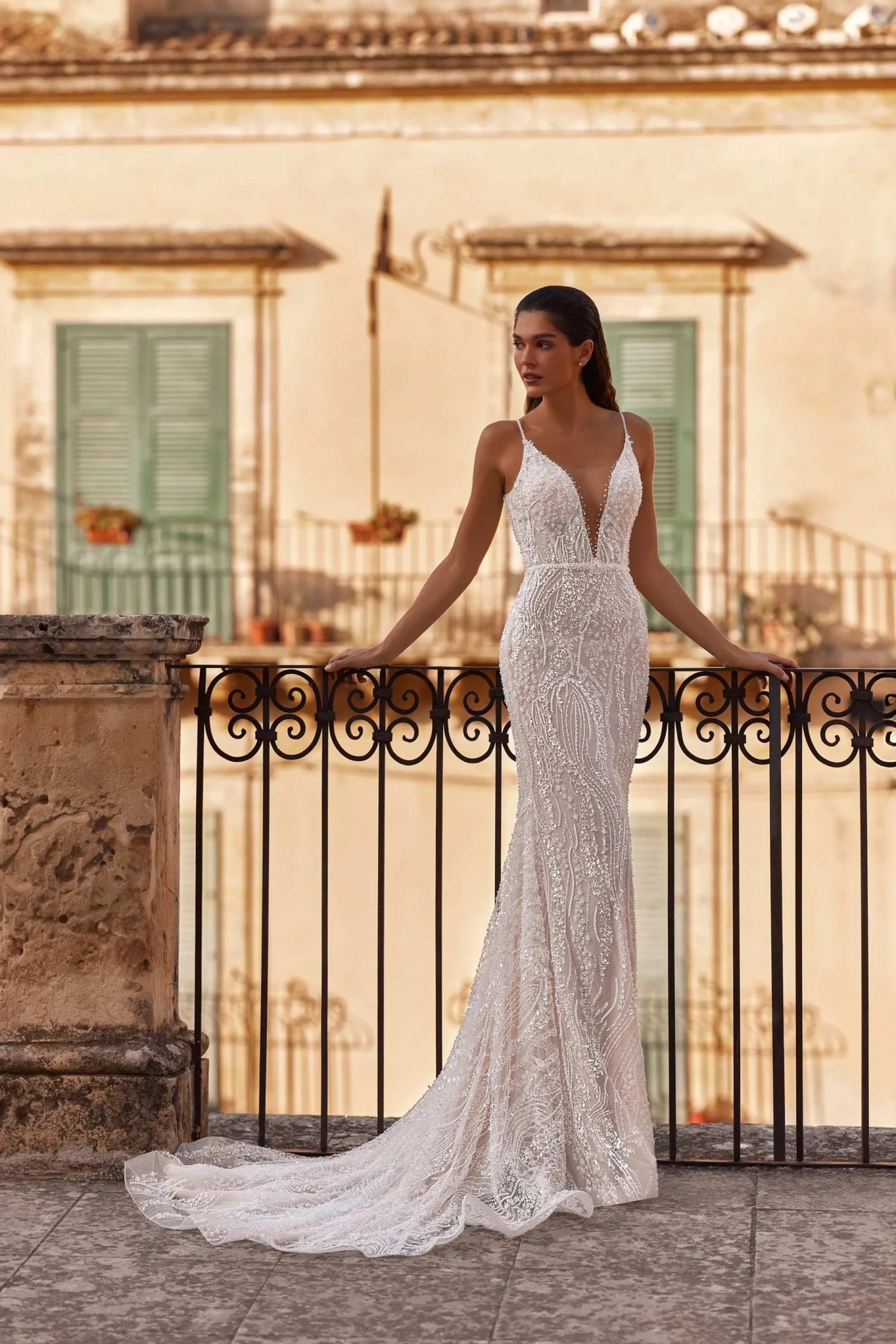 The light skin mermaid-style gown embodies sensuality and elegance. The semi-sheer top features a deep V-neckline extending to the waist, combining embroidery with a central nude mesh insert on thin straps, accentuating the delicate décolleté. The low oval back in nude mesh creates an illusion of bare skin, enhanced with appliqués and removable “beads.” A loop-and-button closure adds refined charm to the look. The fitted lace skirt with a train gently hugs the hips, creating a graceful silhouette. A concealed back zipper maintains clean lines. The model is also available in classic ivory and with a lined skirt.