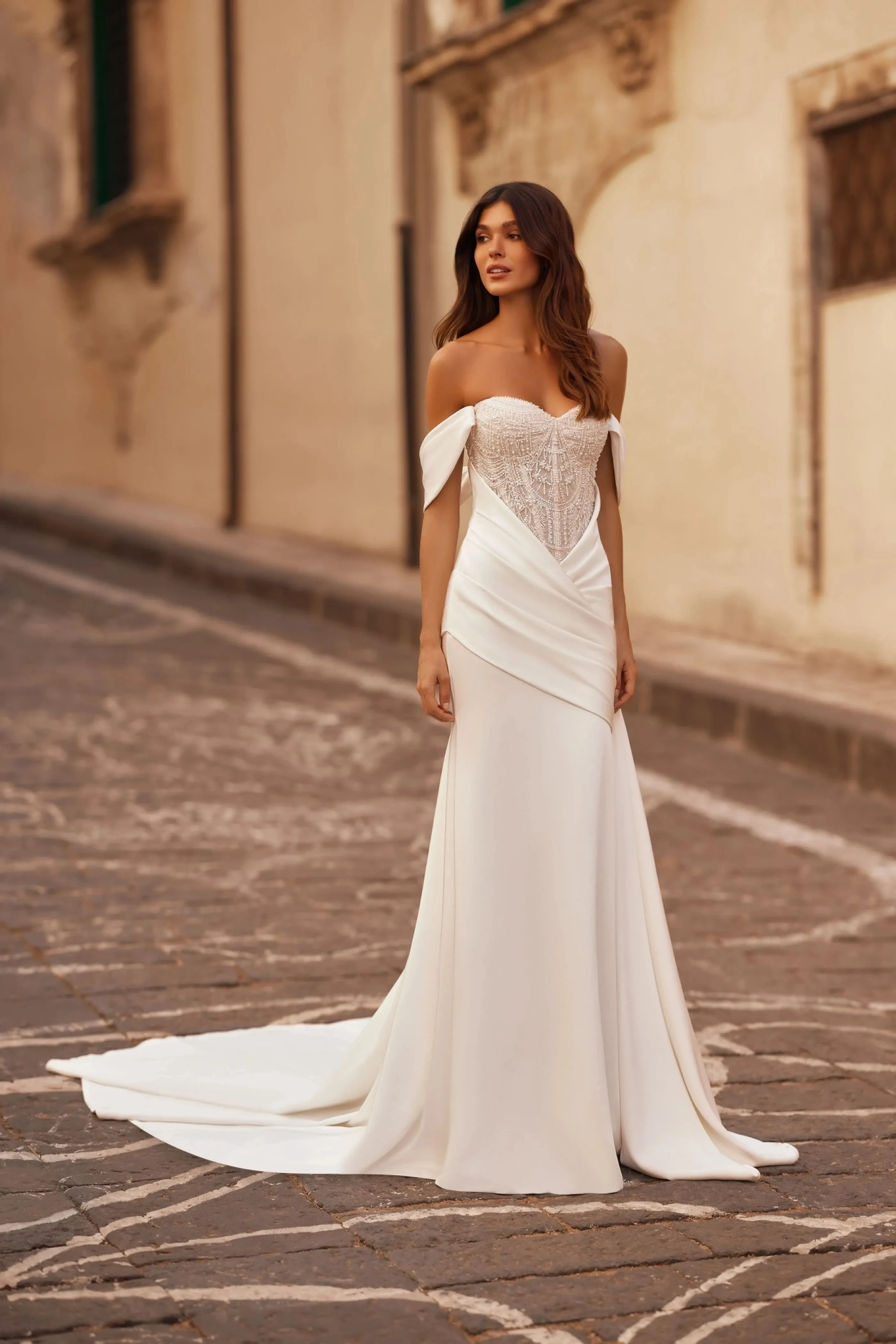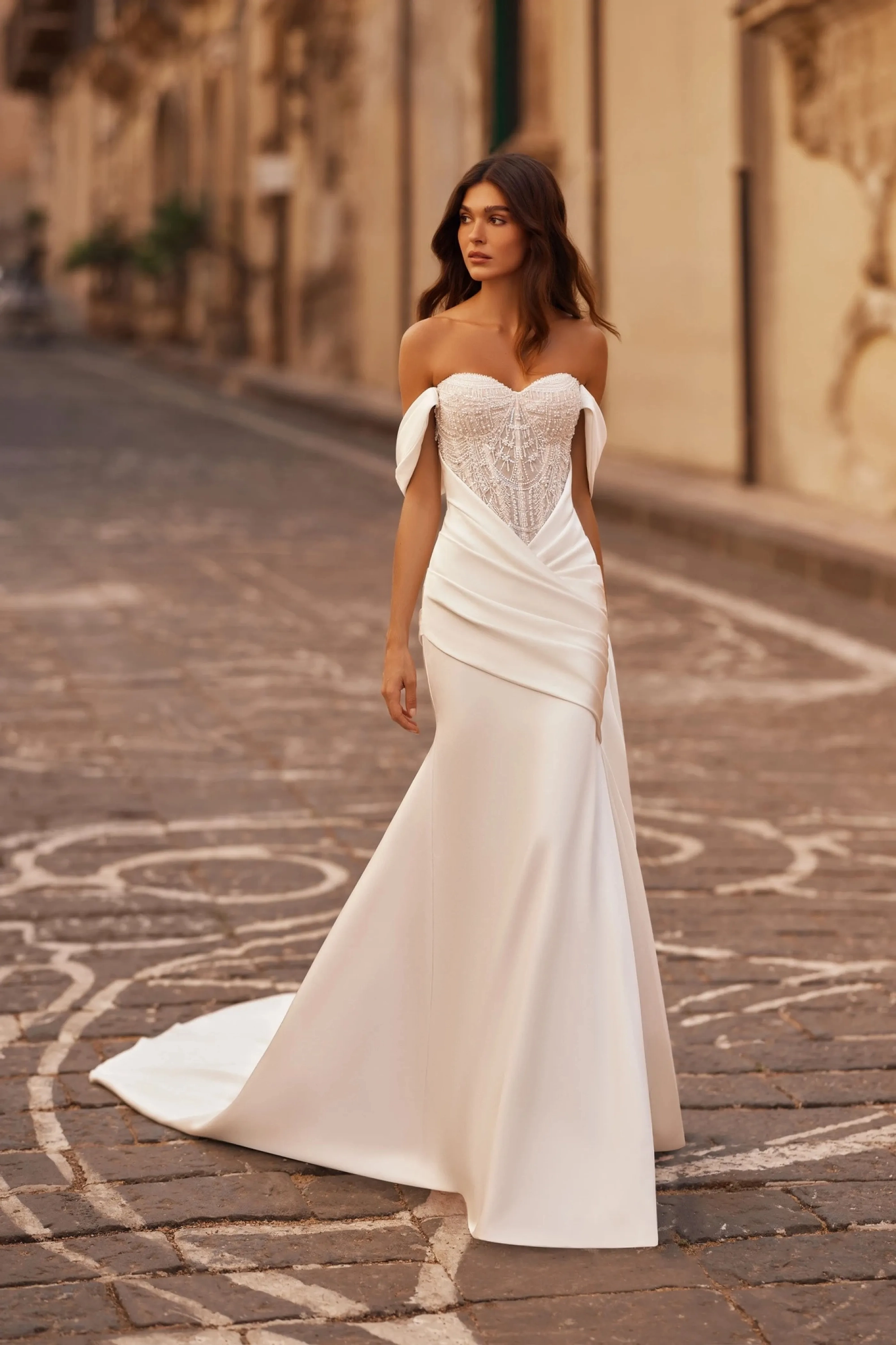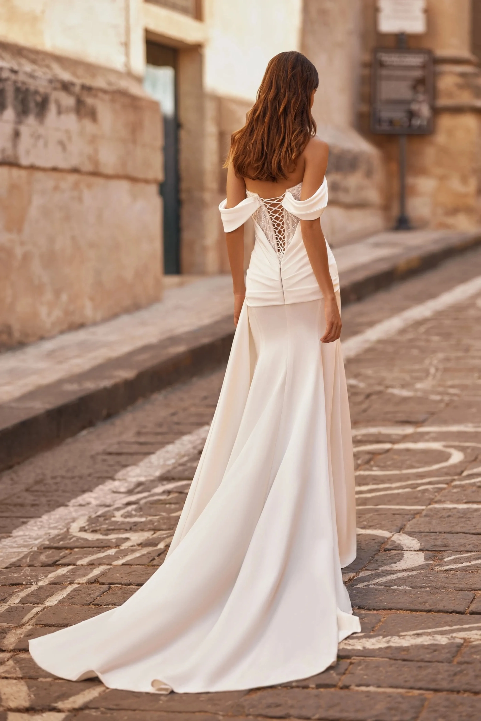 The ivory mermaid-style gown combines elegance with contemporary charm. The semi-sheer sweetheart corset, constructed with cut cups, flows seamlessly into a slightly concave back made of embroidered lace, featuring a loop-and-lacing closure. Wide draped straps cascading over the forearms add softness and grace to the look. The fitted skirt with a train in tailored fabric hugs the hips and emphasizes the silhouette, while the draping creates an elegant textured accent. A concealed back zipper maintains clean lines, and an optional hook-and-eye closure adds flexibility for the fit.