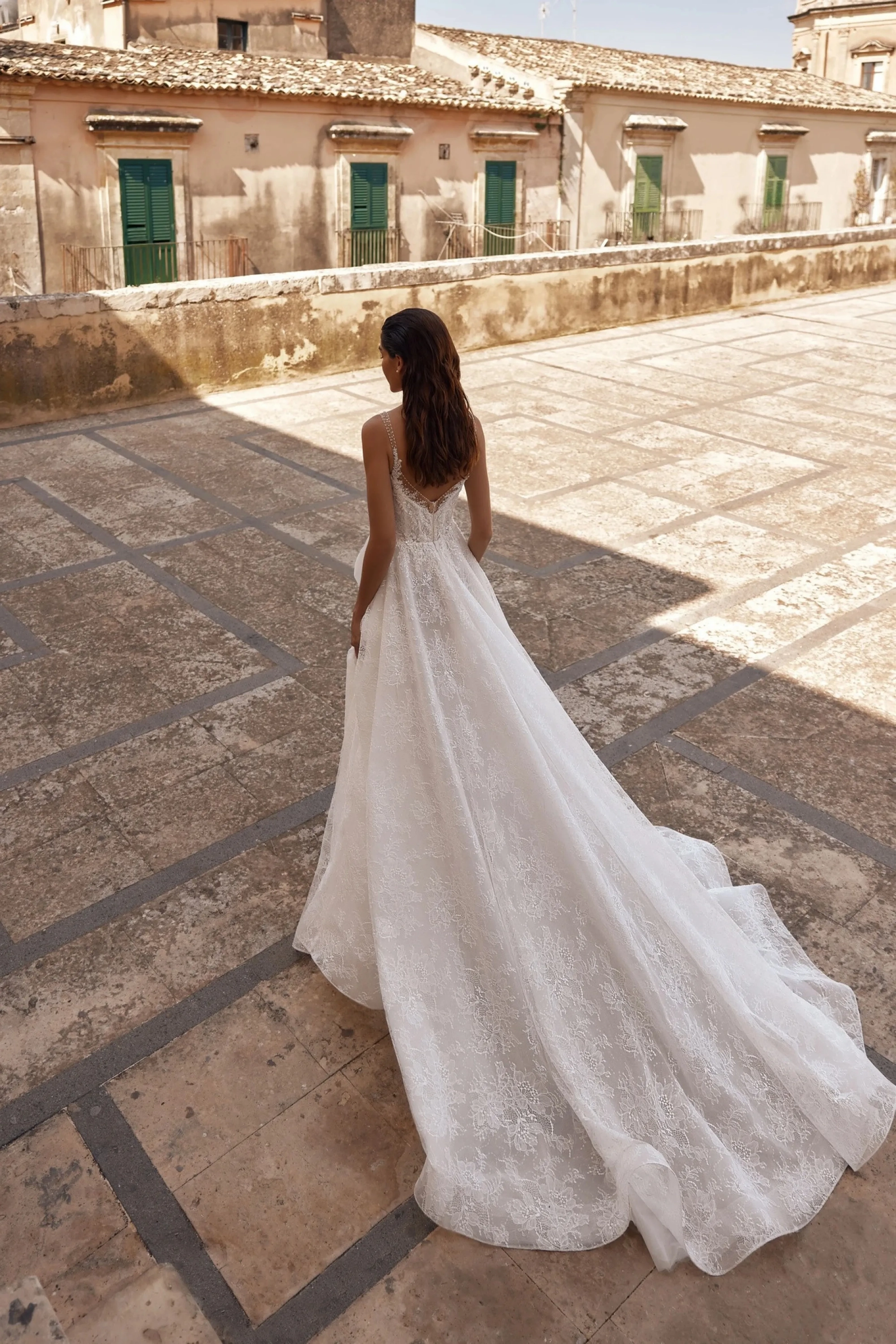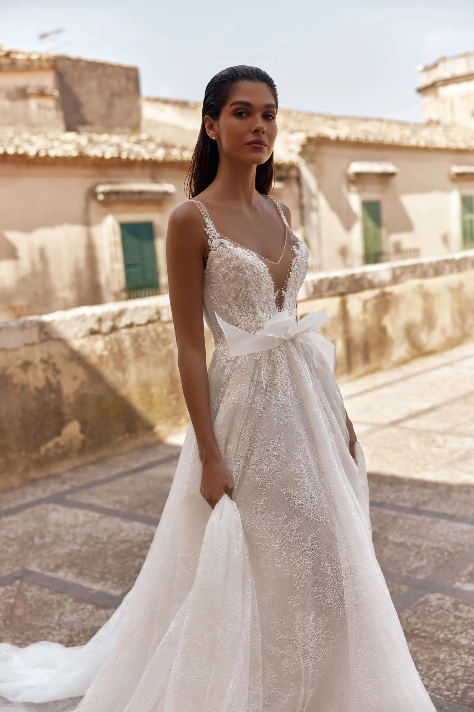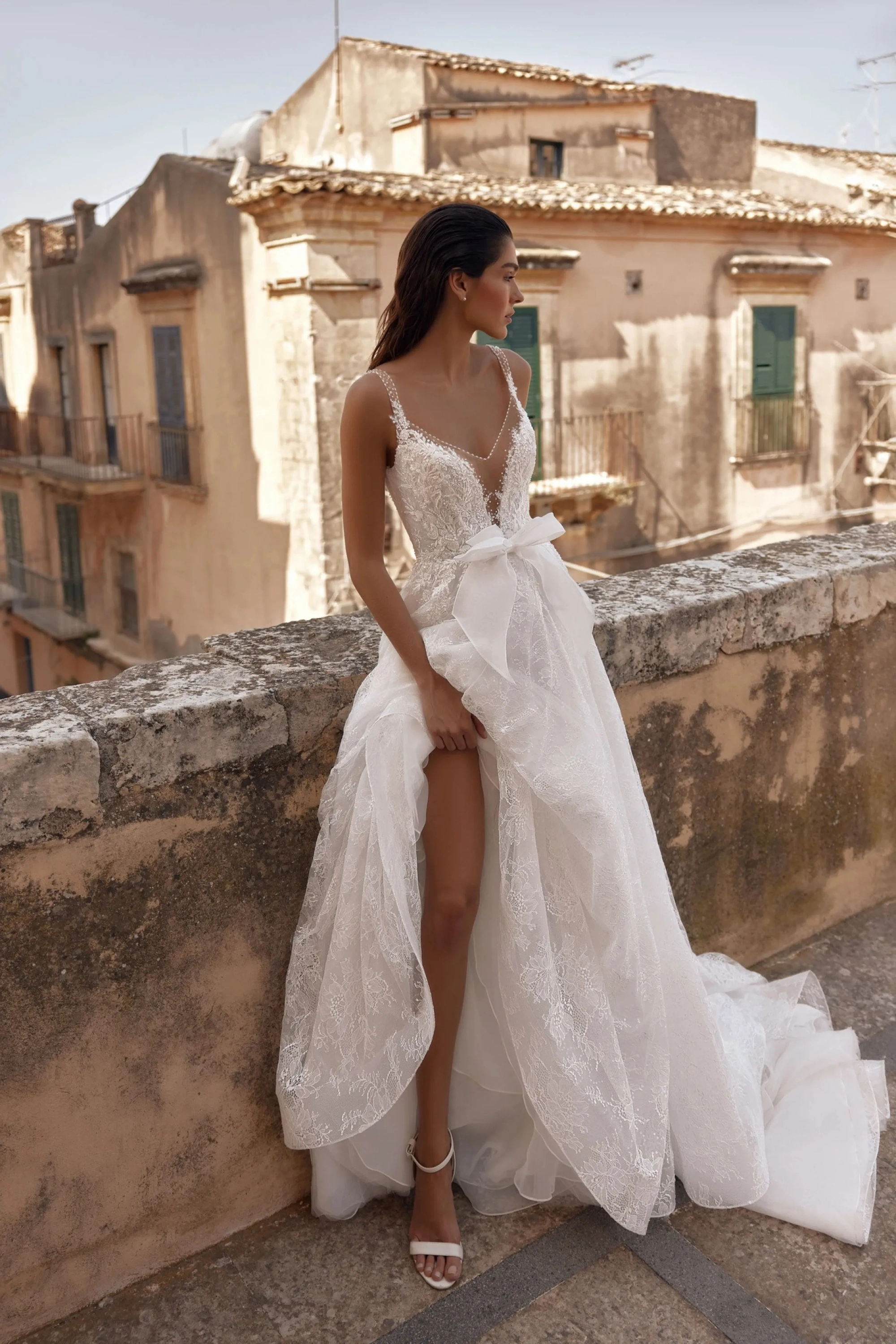 The ivory A-line gown embodies romantic delicacy and grace. The semi-sheer corset with a deep neckline extending to the waist on straps is adorned with embroidered lace, while the central nude insert creates a subtle illusion of bare skin. The oval back in nude mesh adds lightness and refinement, and the hook-and-eye closure with extenders ensures a perfect fit. The full skirt with a train flows gracefully from the waist, with the top layer decorated with embroidered appliqués that harmonize with the corset. A voluminous organza bow at the waistline adds a dreamy charm. A concealed back zipper maintains the clean silhouette. The model is also available with a lined skirt.